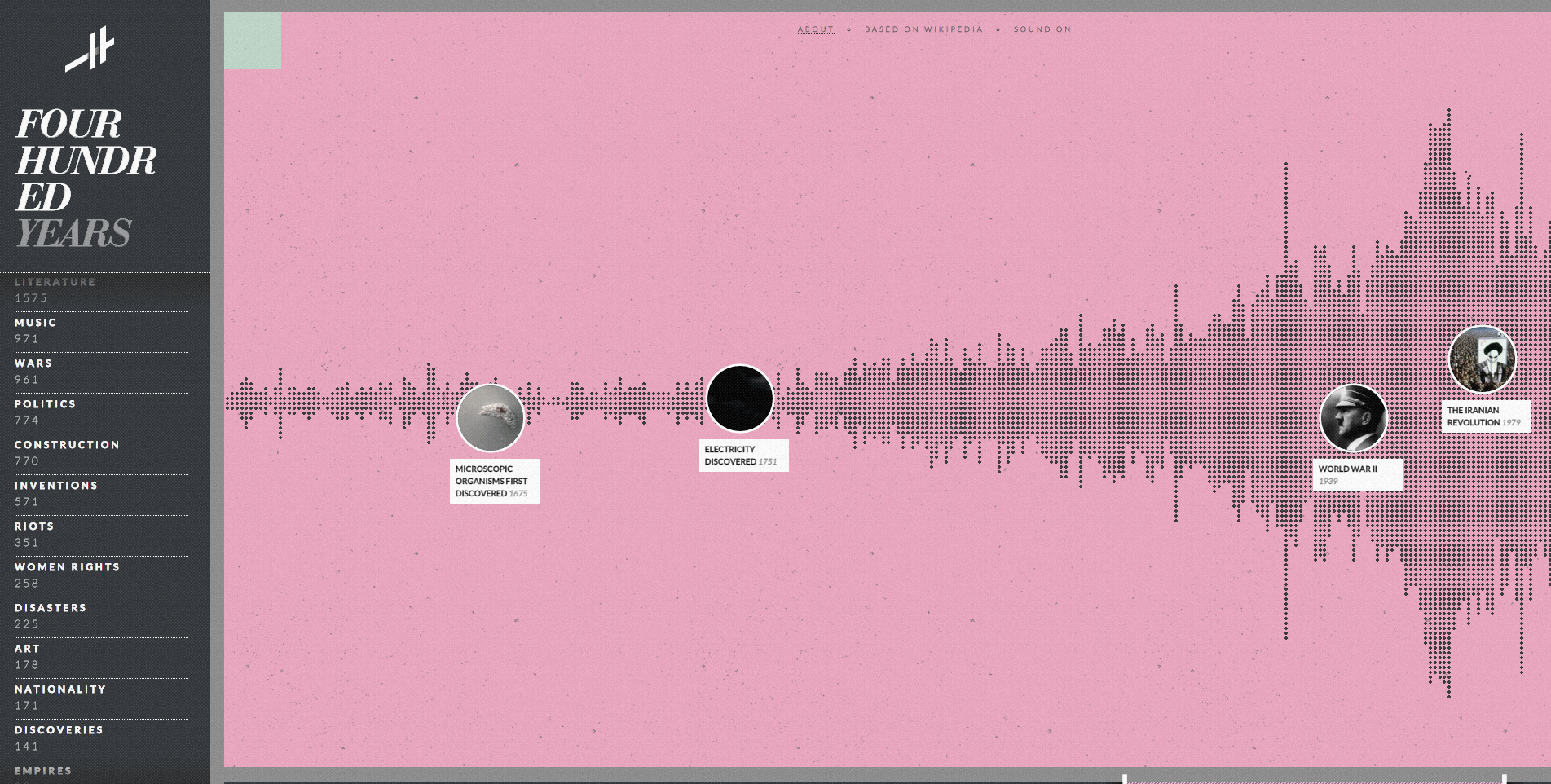 Questo Interactive Designer di Tel Aviv ha già vinto un bel po’ di premi e, guardando i siti che crea, non si fatica a capire il perché. L’ultimo è Four Hundred Years, una timeline interattiva che permette di viaggiare tra gli eventi più importanti accaduti nel mondo, dal Big Bang ad oggi. Letteratura, musica, costruzioni, politica, sommosse, diritti delle donne, invenzioni, disastri, scoperte, per ogni argomento migliaia di puntini portano a scoprire qualcosa di nuovo, o a ricordare qualcosa che già sapevamo. Interessante e dall’utilità infinita, dato che gli eventi si auto-aggiornano grazie alle informazioni di Wikipedia.
