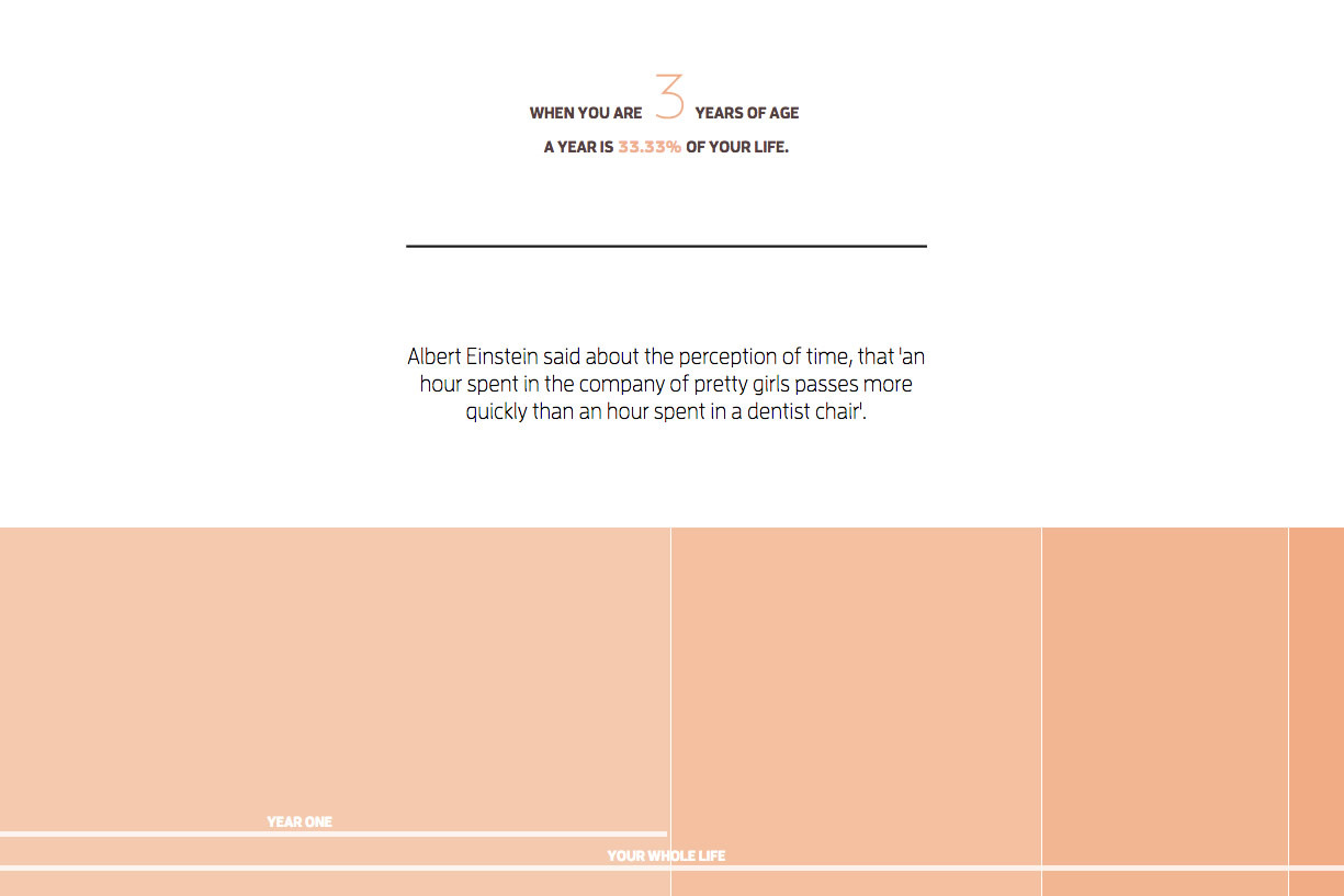 Più che un sito che colpisce per la grafica (pulita, essenziale) è una pagina web interessante per ciò che spiega. Come percepiamo il passare del tempo a 3 anni, a 12, a 80? Tutto cambia, certo, e quel che si capisce nello scroll di questo sito (e quel che è spiegato molto bene) è che “aspettare il Natale per 24 giorni, per un bambino di cinque anni, è come aspettare un anno per un uomo di 54”. Differenti percezioni del passare dei minuti, ma una cosa è certa: il tempo vola, e grazie al designer Maximilian capiamo perché.